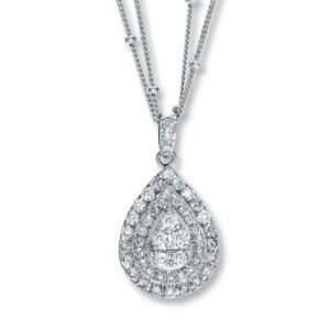 “Mommy” is decorated with sparkling round diamonds and a heart in this adorable necklace for her. Crafted of sterling silver, the 17-inch necklace has a total diamond weight of 1/6 carat. The cable chain fastens with a lobster clasp.